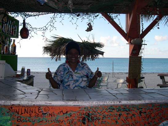 Sherry P. behind her beach bar, Bimini