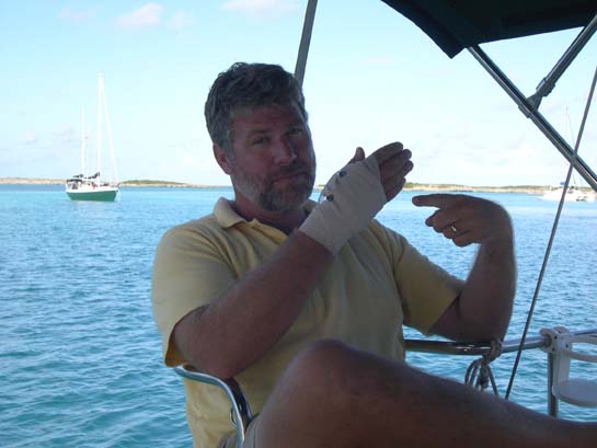 Matthew courting sympathy just after dislocating his thumb, Allen's Cay, Exumas