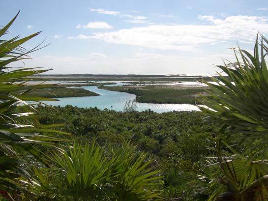 View from Perry's Peak looking southwards, showing both the Exuma Sound / ocean side (left) and the Banks side (right), Bahamian Cays are seldom very wide.