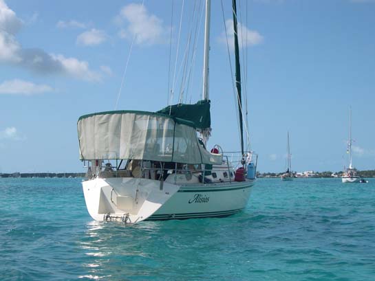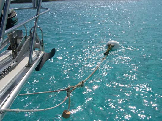 Alisios tied off to a mooring ball, Exumas (We're bridaling the mooring with two lines - each tied off to the mooring's pennant.)