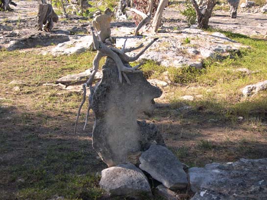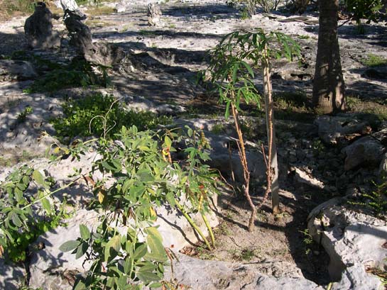 See how waxy-leafed, salt-tollerant plants take root in the potholes. The entire island interiors are like this - almost no soil. The ball on the pole is a fish net float that washed up and someone hung.