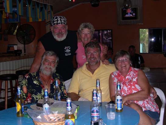 Marceau, Lise, Ernie, Matthew, and Carolyn (Sea Belle, Hispanola, and Alisios) at Scorpio's Bar, Black Point Settlement, Big Guana Cay, Exumas