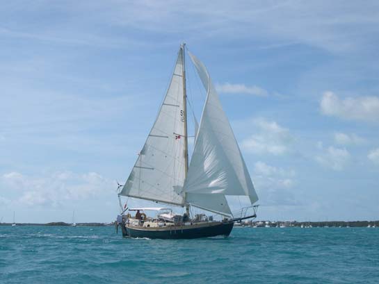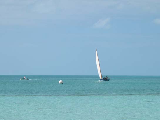 Bahamian sloop crossing the finish line, Farmer's Cay, Exumas