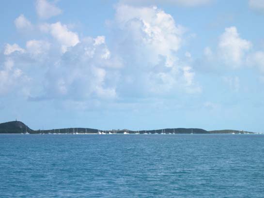 The anchorage off Volleyball Beach as seen from the St. Francis restaurant deck, Georgetown (Alisios is somewhere center-right.)