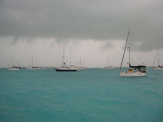 Front passing through the Volleyball beach anchorage, Exumas (The wind howled and the boats really sailed on their anchor lines.)