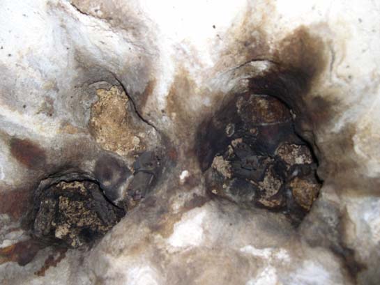 Bats in ceiling hole of cave, Salt Pond, Long Island (Illumated by camera flash.)