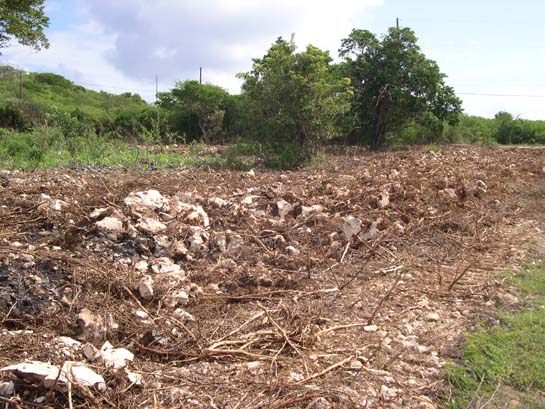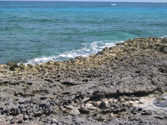 Looking across the iron-shore from Little Water Cay to Water Cay (The normal shoreline is iorn shore with only a few small beaches within little coves.)