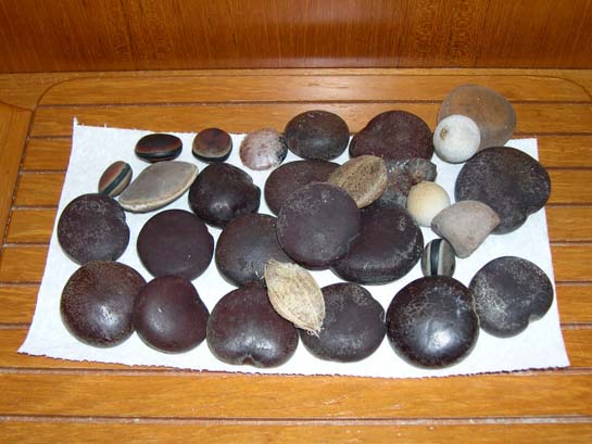 Various sea beans - mostly hearts, a few hamburgers, + some junk seeds to show what washes up