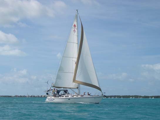 Alisios' mainsail reflected int the water of the Great Bahama Bank