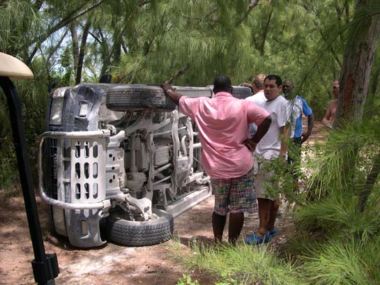Pondering how to flip it back, Norman's Cay (Done 15 minutes later with the help of a jeep and a rope)