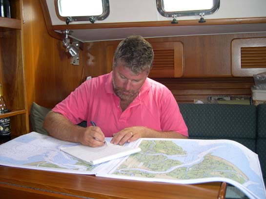 Gail studying snorkeling sites, Exumas