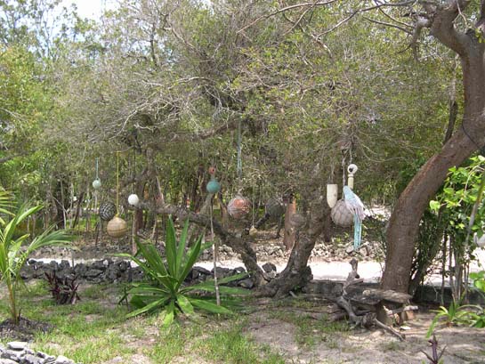 Fish net floats in a tree, Man-O-War Cay (These fish net floats wash up regularly on the Atlantic-facing shores and are hung as decoration.)