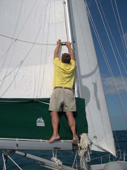 Matthew repairing one of the batten slides as we were crossing the Banks towards the ocean (No need to take the sail down if you can reach it by standing on the boom on your tip-toes.)