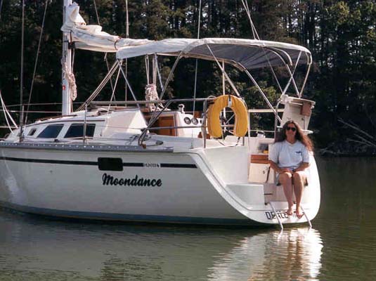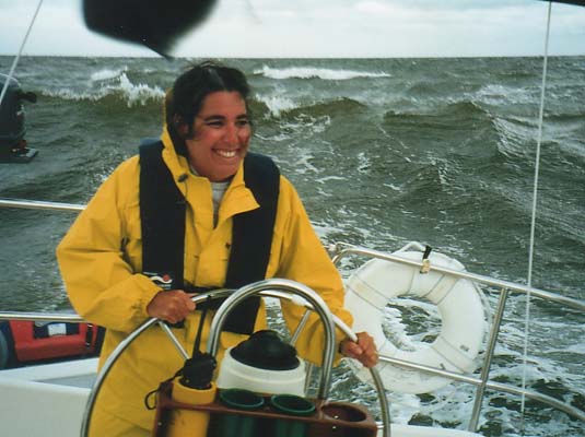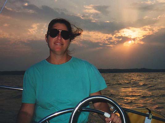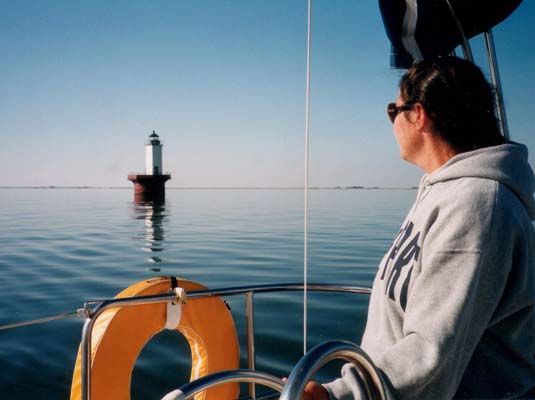 Gail looking over the stern of Moondance at Solomons Lump Light